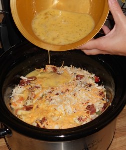 - Beat the eggs, milk, mustard, salt and pepper together. Pour this over the whole mixture. Cook on low for ten to twelve hours.
